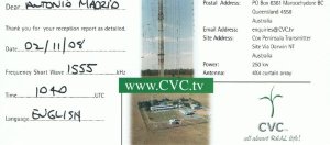 Australia, CVC-Darwin, 15550 Khz, 1040 UTC, QSL datos completos sin verificador, informe enviado a dxer@cvc.tv, transcurridos 72 dĆ­as.