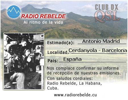 Recibida E-QSL Radio Rebelde, en Español, de 0025-0035 UTC, 1.620,0 Khz, Tardo :10 dias, informe enviado a: web@radiorebelde.icrt.cu
