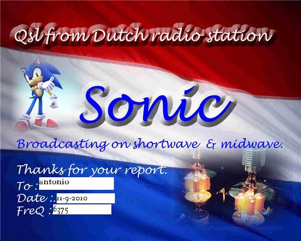 Recibida E-QSL de Radio Sonic, Ingles, de 1839-1859 UTC, en 6.375,0 Khz, Recibida en :1 dia, Informe enviado a: jaccoenmirjam@hotmail.com