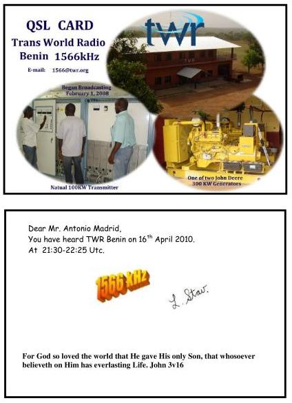 Recibidida E-QSL de TWR-Parakou, en Ingles de 2130-2225UTC, 1.566,0 Khz, Tardó:123 dias, Informe recibido de:lstavrop@twr.org , V/S:Lorraine Stavropoulos