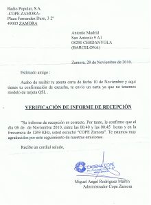 Recibida Carta-QSL de Cope-Zamora en 32 días, 0040 HEA, 1.269,0 Khz, Informe enviado a: Plaza Fernandez Duro 3, 2º, 49003 Zamora, V/S:Miguel Angel Rodriguez