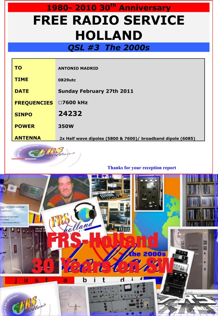 Recibida E-QSL de FRSH , 0829 UTC, 7.600,0 Khz, llegó en 197 dias, Informe enviado a : frs.holland@hccnet.nl , QSL Especial 30 Aniversario – V/S:DAVE SCOTT – Peter V