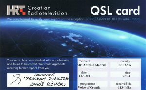 Recibida QSL de la Voz de Croacia , programa en Español , 2334 UTC, 1.134,0 Khz, llegó en 328 días, informe enviado a : Prisavlje 3, 10000 Zagreb, Croatia V/S: Janos Römer+ Tras varios envios en diferentes direcciones de e-mail con sus reclamanciones envie el informe por correo ordinario con un CD con la grabacion de la escucha.
