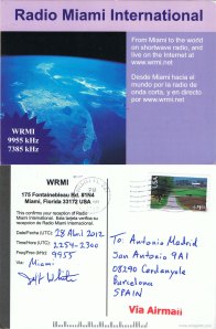 Recibida QSL de R.Miami Inter. 2254 UTC, 9.955,0 Khz, llegó en 16 dias, informe via formulario en la web de la emisora : http://www.wrmi.net V/S: Jeff White