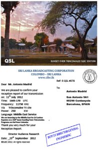 Recibida E-QSL de Sri Lanka B.C. , programa en Sinhala, 1645 UTC, 11,750.0 KHz, llego en 73 días, Informe enviado 2 veces a : victor.goonetilleke@gmail.com. v/s Victor Goonetilleke