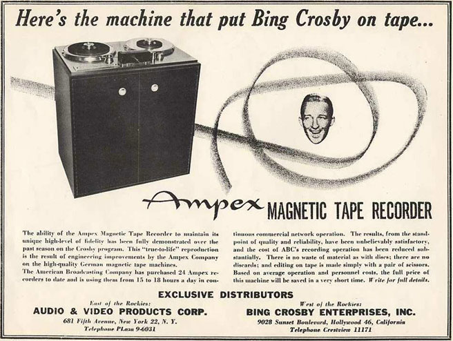 En junio de 1947, Mullin, quen estaba lanzando la tecnología a los importantes estudios de película en Hollywood, tuvo la oportunidad de demostrar su grabadora modificada de cinta a Crosby. Cuando Crosby escuchó la demostración de la grabadora de cinta de Mullin, prepararon una prueba para su programa de radio.
