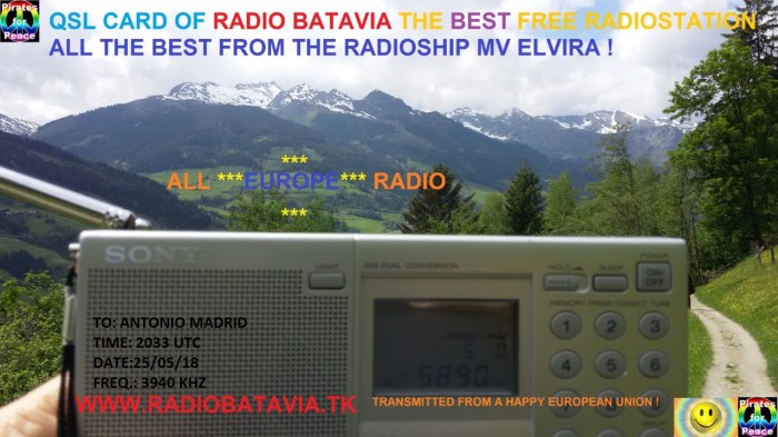 Recibida E-QSL de Radio Batavia escuchada el 25/05/2018 a las 2033 UTC, 3940,0 Khz, llegó en 43 días.Informe enviado a: batavia@hotmail.com