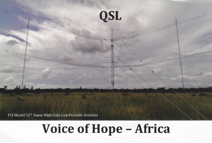 ZAMBIA: Voice of Hope Africa 13680 kHz. Full data QSL card received in 7 days from the US office for report with audio clip sent to reports@voiceofhope.com v/s Ray Robinson, Vice President Global Operations.
