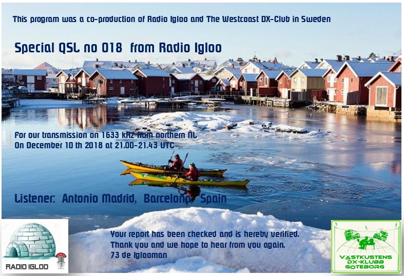 Recibida E-QSL de Radio Igloo Por elradioescucha el 13/12/2018 Recibida E-QSL de la emisora Radio Igloo escuchada a las 2140UTC por los 1633,0 Khz , llegó en 2 dias enviando el informe de Recepción a: radioigloo@gmail.com Anuncios Ultimas Entradas 27/12/2025 Sender Waldheim regresa a la onda corta en DRM 27/12/2025 Glenn Hauser’s World of Radio 2327 27/12/2025 Frecuencia Al Día Nº964 26/12/2025 SM Radio Dessau en el aire este 26 de Diciembre 2025 Comparte esto: Haz clic para compartir en X (Se abre en una ventana nueva) X Haz clic para compartir en Facebook (Se abre en una ventana nueva) Facebook Haz clic para compartir en Bluesky (Se abre en una ventana nueva) Bluesky Haz clic para compartir en Mastodon (Se abre en una ventana nueva) Mastodon Haz clic para compartir en Pinterest (Se abre en una ventana nueva) Pinterest Haz clic para compartir en WhatsApp (Se abre en una ventana nueva) WhatsApp Haz clic para compartir en Telegram (Se abre en una ventana nueva) Telegram Haz clic para imprimir (Se abre en una ventana nueva) Imprimir Haz clic para enviar un enlace por correo electrónico a un amigo (Se abre en una ventana nueva) Correo electrónico Haz clic para compartir en Pocket (Se abre en una ventana nueva) Pocket Haz clic para compartir en Reddit (Se abre en una ventana nueva) Reddit Me gusta Cargando...‹ Radio Free Asia desde AlemaniaRadio Oman parece haber dejado la Onda Corta ›Categorías:Pirata, QSLEtiquetas:E-QSL, Emisora Pirata, Radio Igloo, Verificacion Artículos relacionados Recibida E-QSL de Radio Bizon Recibida E-QSL de Radio Luka Recibida E-QSL de Radio Spakenburg Recibida E-QSL Enterprise Radio