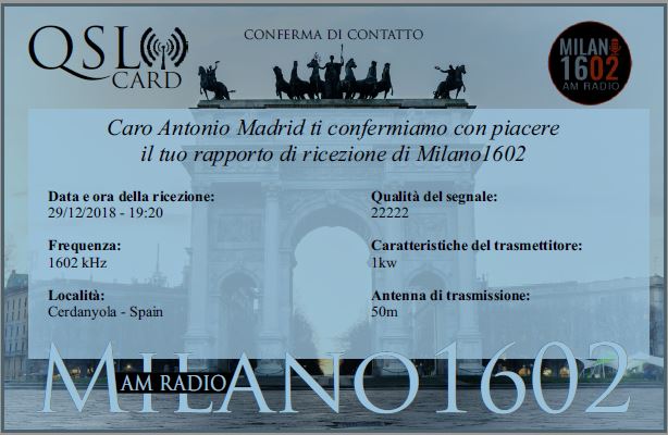 Recibida verificación con E-QSL de Milano 1602 AM Radio, escuchada a las 1920 UTC en los 1602,0 Khz, llegó en 26 días, enviado informe a: qsl@radiomilano1602.it