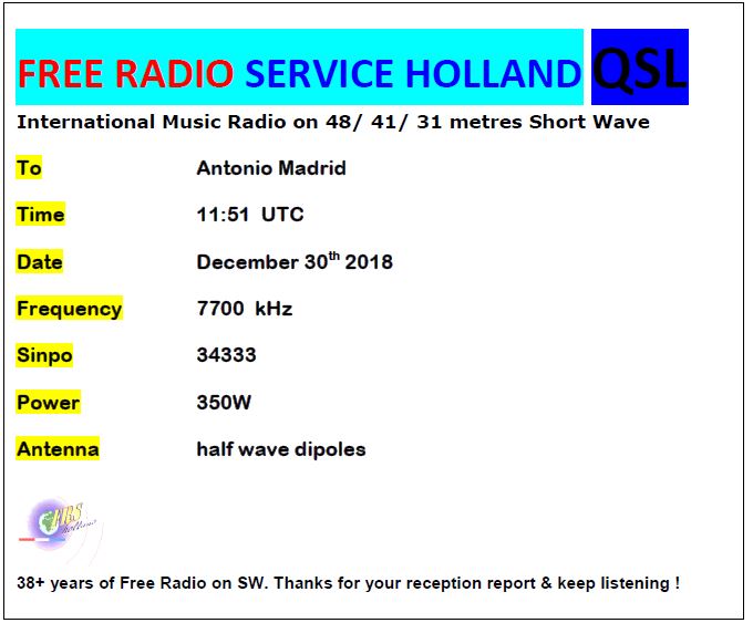 Recibida verificación E-QSL de FRSH escuchada a las 1151 UTC en los 7700,0 Khz, llegó en 38 días , informe enviado a: frs@frsholland.nl V/S:Peter V.