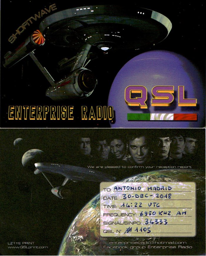 Recibida Tarjeta postal QSL de la emisora italiana Enterprise Radio , escuchada a las 1410-1422 UTC en la frecuencia de 6950,0 Khz, llegó en 42 días.+ Pegatina, Informe enviado a : enterpriseradio@hotmail.com , V/S:Denny