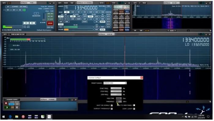 Esto hace SDRuno el primer paquete de DEG con todas las funciones con el escaneo de frecuencia integrado. El escáner tiene 2 modos; que puede escanear una gama de frecuencia arbitraria con una trama definida o puede escanear a través de una lista de frecuencias desde el panel de memoria.