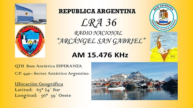 LRA 36 Radio Nacional Arcángel San Gabriel, Base Esperana en la Antártida, 15476 kHz, según la información del operador de la estación, estará en el aire el viernes 6 de marzo a las 1900 UTC con un programa especial sobre «Campaña Antártida de Verano».