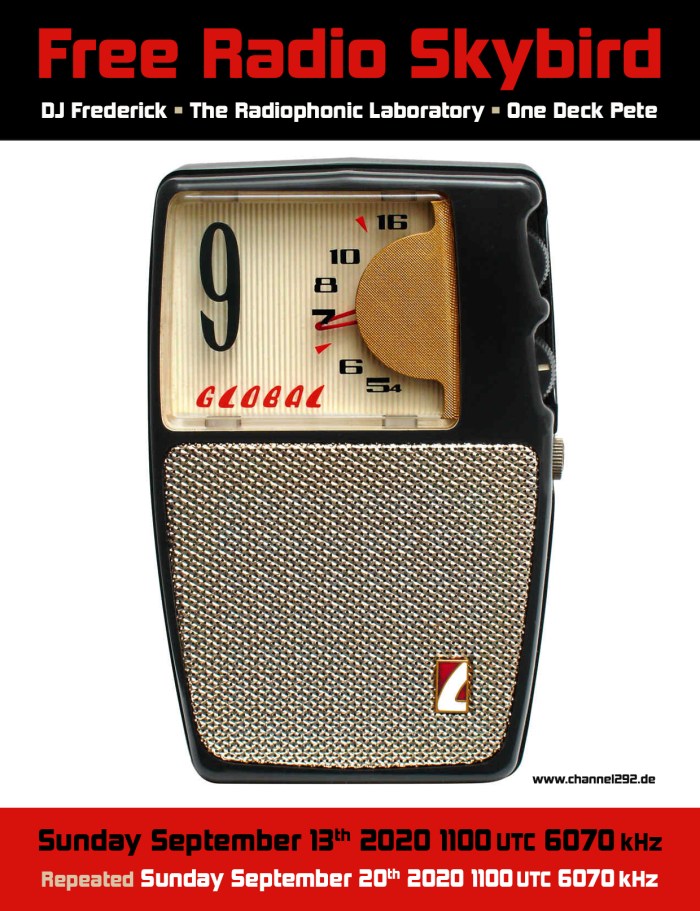 It’s heavy on radio transmissions this month with the return of DJ Frederick’s Free Radio Skybird on Sunday 20th September at 1100 UTC (12 Noon UK time) on 6070 kHz shortwave via Channel 292 (and repeated the week after.) If you haven’t got a suitable radio it can also be heard on the SDR link on their site here. The first programme will feature DJ Frederick, Justin Patrick Moore’s Radiophonic Laboratory and our very own One Deck Pete with his «Who’d be a pirate» mix. 49 metres is again where it’s all at!