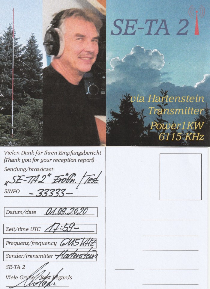 Recibida E-QSL de la emisora Alemana SE-TA2 escuchada a las 1759 UTC en la frecuencia de 6115 KHz. en idioma Alemán, llegó en 11 días, informe enviado a: se-ta@web.de V/S: Christoph Gerber