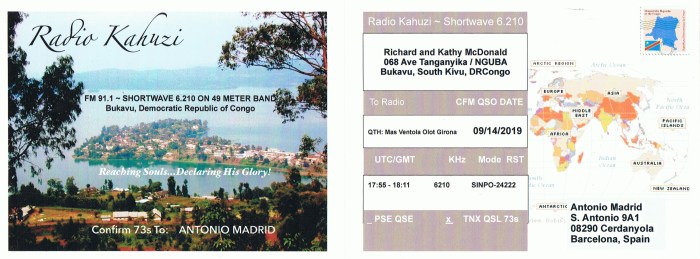 Recibida Tarjeta QSL de la emisora de la Republica Democrática del Congo, Radio Kahuzi escuchada a las 1755 UTC en la frecuencia de 6210 KHz. en idioma Vernáculo, llegó en 555 días, informe enviado a: radiokahuzi@sbcglobal.net