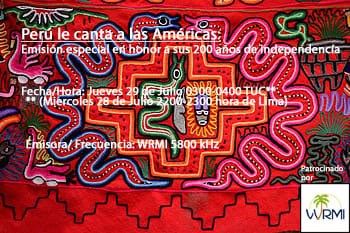 En honor al bicentenario de la independencia del Perú, una hora especial de música peruana conducida por Luis Alejandro Vallebueno con los invitados Estefania Rivera y «Uncle Bill» Tilford se transmitirá por WRMI, que patrocina el programa.