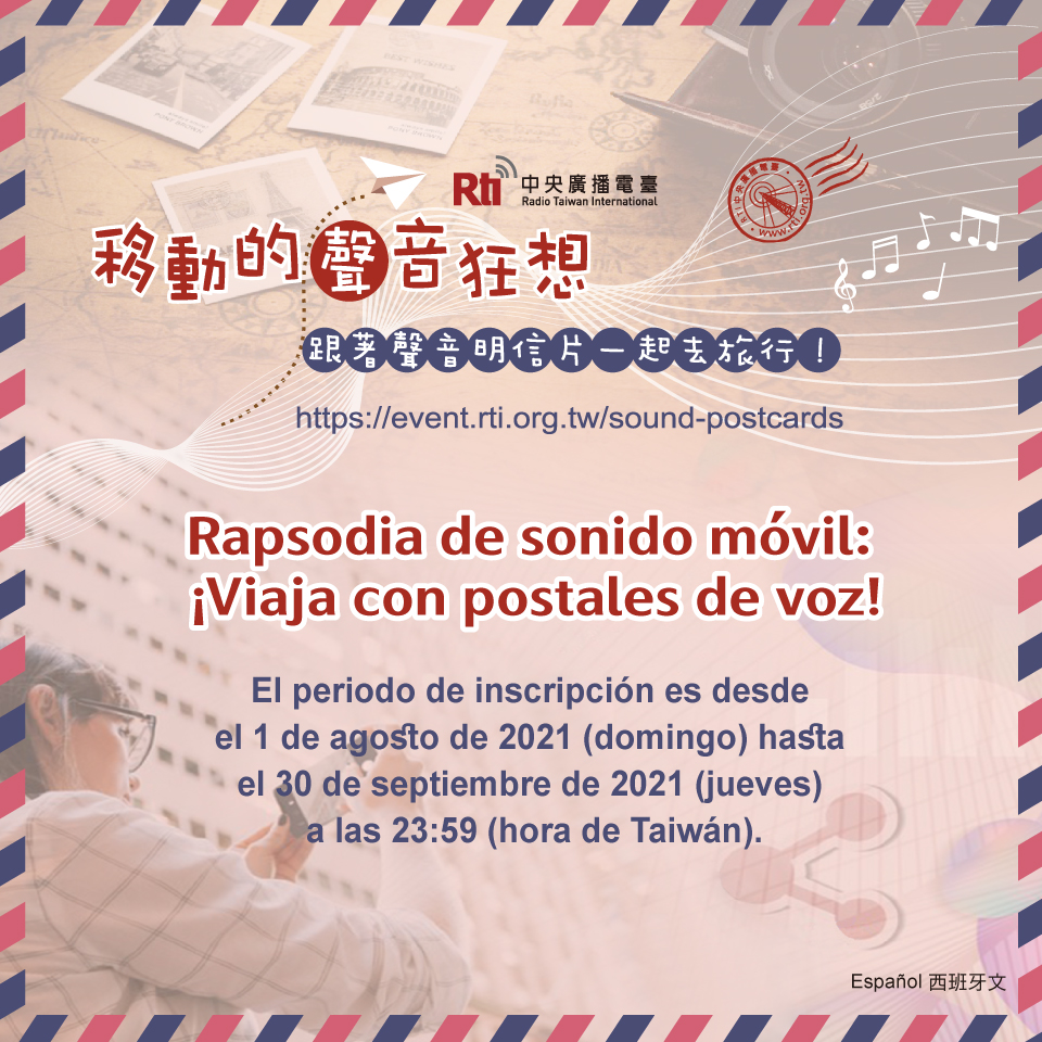 Tiene tiempo hasta el 30 de septiembre del 2021 para participar. Para más información: https://event.rti.org.tw/sound-postcards/es/home-es/
