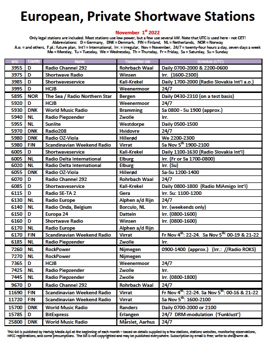 Actualizado Listado de Emisoras Privadas Europeas – Noviembre 2022 Por elradioescucha el 02/11/2022 Anuncios Ultimas Entradas 10/01/2026 Frecuencia Al Día Nº966 10/01/2026 Glenn Hauser’s World of Radio 2329 09/01/2026 Radio Caroline North 10 y 11 de Enero 2026 09/01/2026 Shortwave Radiogram, del 9 al 15 de Enero 2026: programa 432 Comparte esto: Haz clic para compartir en X (Se abre en una ventana nueva) X Haz clic para compartir en Facebook (Se abre en una ventana nueva) Facebook Haz clic para compartir en Bluesky (Se abre en una ventana nueva) Bluesky Haz clic para compartir en Mastodon (Se abre en una ventana nueva) Mastodon Haz clic para compartir en Pinterest (Se abre en una ventana nueva) Pinterest Haz clic para compartir en WhatsApp (Se abre en una ventana nueva) WhatsApp Haz clic para compartir en Telegram (Se abre en una ventana nueva) Telegram Haz clic para imprimir (Se abre en una ventana nueva) Imprimir Haz clic para enviar un enlace por correo electrónico a un amigo (Se abre en una ventana nueva) Correo electrónico Haz clic para compartir en Pocket (Se abre en una ventana nueva) Pocket Haz clic para compartir en Reddit (Se abre en una ventana nueva) Reddit Me gusta Cargando...‹ Radio Exterior de España, Frecuencias Invierno 2022-23L’altra ràdio – La Setmana de la Ciència ›Categorías:FrecuenciasEtiquetas:Emisora de Onda Corta, Emisoras Privadas, Onda Corta, Shortwave, SWL Artículos relacionados Ya disponible -World English Survey – Agosto 2025 Ya disponible -World English Survey – July 2025 Actualizado Listado de Emisoras Privadas Europeas – Julio 2024 Actualizado Listado de Emisoras Privadas Europeas – Junio 2024