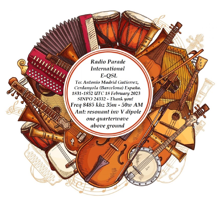 Recibida E-QSL de la emisora Radio Parade Inter. desde Irlanda ,escuchada a las 1831 UTC en la frecuencia de 8485 KHz. en idioma Ingles, llegó en 1h , informe enviado a: radioparade@protonmail.com V/S:Alex
