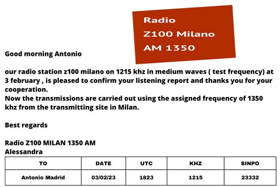 Recibida E-QSL de la emisora Radio Z100 desde Italia ,escuchada a las 1823 UTC en la frecuencia de 1215 KHz. en idioma Italiano, llegó en 57 días, informe enviado a: radioz100milano@gmail.com V/S:Alessandra