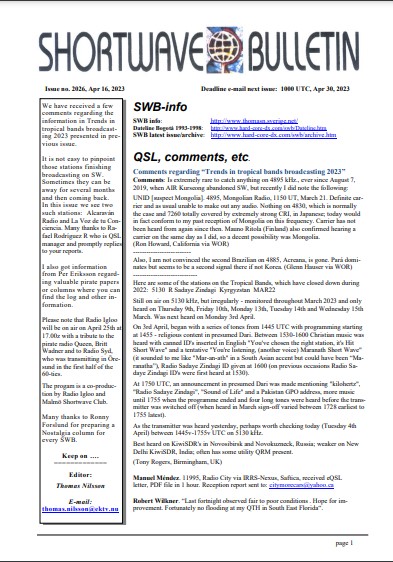 Ya disponible Shortwave Bulletin nº2026 Por elradioescucha el 17/04/2023 Fuente:http://www.hard-core-dx.com/swb/archive.htm Anuncios Ultimas Entradas 19/12/2025 Carrera por las licencias de FM en Suecia 19/12/2025 Ya Disponible ‘Music on Shortwave’ B25-V3.0 19/12/2025 Próximas emisiones de las estaciones imaginarias 19/12/2025 Shortwave Radiogram, del 19/12/25 al 1/1/26: programa 430 Comparte esto: Haz clic para compartir en X (Se abre en una ventana nueva) X Haz clic para compartir en Facebook (Se abre en una ventana nueva) Facebook Haz clic para compartir en Bluesky (Se abre en una ventana nueva) Bluesky Haz clic para compartir en Mastodon (Se abre en una ventana nueva) Mastodon Haz clic para compartir en Pinterest (Se abre en una ventana nueva) Pinterest Haz clic para compartir en WhatsApp (Se abre en una ventana nueva) WhatsApp Haz clic para compartir en Telegram (Se abre en una ventana nueva) Telegram Haz clic para imprimir (Se abre en una ventana nueva) Imprimir Haz clic para enviar un enlace por correo electrónico a un amigo (Se abre en una ventana nueva) Correo electrónico Haz clic para compartir en Pocket (Se abre en una ventana nueva) Pocket Haz clic para compartir en Reddit (Se abre en una ventana nueva) Reddit Me gusta Cargando...‹ En Contacto – Radio Habana CubaYa Disponible Guía de la Radio Nº 1305 ›Categorías:PublicaciónEtiquetas:Frecuencias, Onda Corta, Shortwave, Shortwave Bulletin, SWL Artículos relacionados Boletín RUS-DX #1372 WORLDWIDE DX CLUB Top News #1638 Ya disponible Radiorama Numero 134– A.I.R. – Ya disponible Shortwave Bulletin nº2094