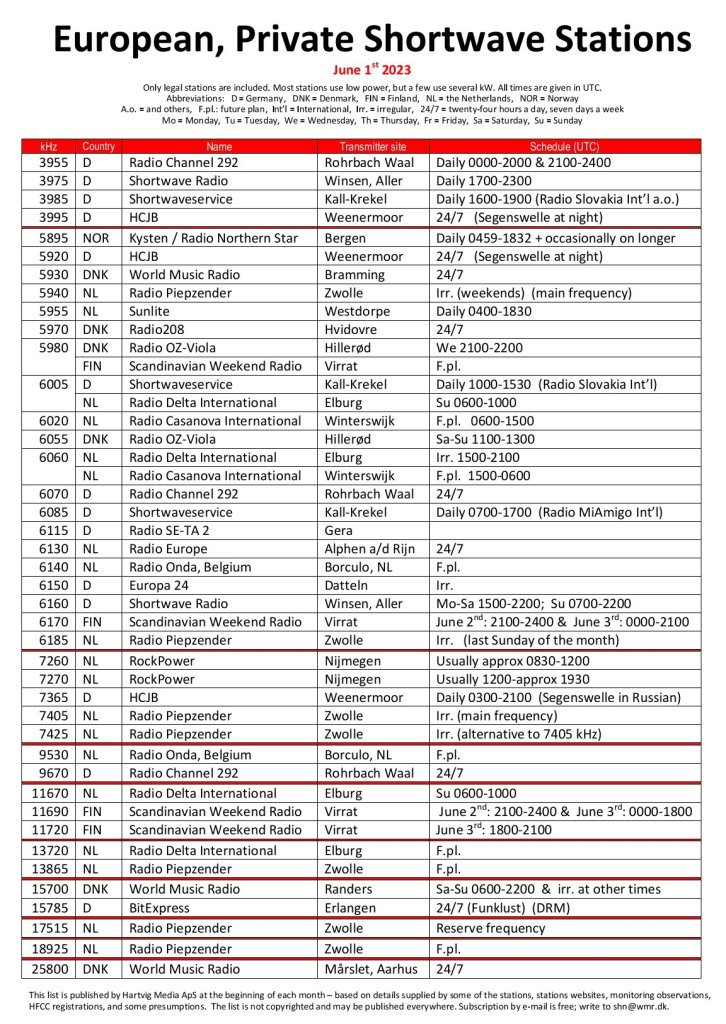 Actualizado Listado de Emisoras Privadas Europeas – Junio 2023 Por elradioescucha el 05/06/2023 Anuncios Ultimas Entradas 20/12/2025 Reino Unido: Disfruta de la transmisión de Navidad del Rey en Onda Larga este año 20/12/2025 Radio City en el aire vía IRRS Milano 20/12/2025 Frecuencia Al Día Nº963 20/12/2025 Glenn Hauser’s World of Radio 2326 Comparte esto: Haz clic para compartir en X (Se abre en una ventana nueva) X Haz clic para compartir en Facebook (Se abre en una ventana nueva) Facebook Haz clic para compartir en Bluesky (Se abre en una ventana nueva) Bluesky Haz clic para compartir en Mastodon (Se abre en una ventana nueva) Mastodon Haz clic para compartir en Pinterest (Se abre en una ventana nueva) Pinterest Haz clic para compartir en WhatsApp (Se abre en una ventana nueva) WhatsApp Haz clic para compartir en Telegram (Se abre en una ventana nueva) Telegram Haz clic para imprimir (Se abre en una ventana nueva) Imprimir Haz clic para enviar un enlace por correo electrónico a un amigo (Se abre en una ventana nueva) Correo electrónico Haz clic para compartir en Pocket (Se abre en una ventana nueva) Pocket Haz clic para compartir en Reddit (Se abre en una ventana nueva) Reddit Me gusta Cargando...‹ En Contacto – Radio Habana CubaYa Disponible Guía de la Radio Nº 1312 ›Categorías:FrecuenciasEtiquetas:Emisora de Onda Corta, Emisoras Privadas, Onda Corta, Shortwave, SWL Artículos relacionados Ya disponible -World English Survey – Agosto 2025 Ya disponible -World English Survey – July 2025 Actualizado Listado de Emisoras Privadas Europeas – Julio 2024 Actualizado Listado de Emisoras Privadas Europeas – Junio 2024