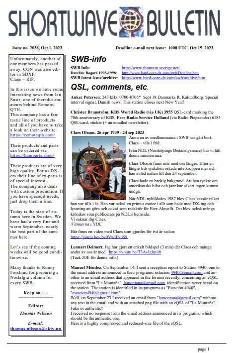 Ya disponible Shortwave Bulletin nº2038 Por elradioescucha el 06/10/2023 Enlace para la descarga:http://www.hard-core-dx.com/swb/archive.htm Anuncios Ultimas Entradas 09/01/2026 Radio Caroline North 10 y 11 de Enero 2026 09/01/2026 Shortwave Radiogram, del 9 al 15 de Enero 2026: programa 432 09/01/2026 Próximas emisiones de las estaciones imaginarias 08/01/2026 Radio Tumbril – Programación Encore Comparte esto: Haz clic para compartir en X (Se abre en una ventana nueva) X Haz clic para compartir en Facebook (Se abre en una ventana nueva) Facebook Haz clic para compartir en Bluesky (Se abre en una ventana nueva) Bluesky Haz clic para compartir en Mastodon (Se abre en una ventana nueva) Mastodon Haz clic para compartir en Pinterest (Se abre en una ventana nueva) Pinterest Haz clic para compartir en WhatsApp (Se abre en una ventana nueva) WhatsApp Haz clic para compartir en Telegram (Se abre en una ventana nueva) Telegram Haz clic para imprimir (Se abre en una ventana nueva) Imprimir Haz clic para enviar un enlace por correo electrónico a un amigo (Se abre en una ventana nueva) Correo electrónico Haz clic para compartir en Pocket (Se abre en una ventana nueva) Pocket Haz clic para compartir en Reddit (Se abre en una ventana nueva) Reddit Me gusta Cargando...‹ SWR- Scandinavian Weekend Radio en el aire este fin de semanaShortwave Radiogram, del 5 al 9 de Octubre: programa 325 ›Categorías:PublicaciónEtiquetas:Frecuencias, Onda Corta, Shortwave, Shortwave Bulletin, SWL Artículos relacionados Ya disponible Shortwave Bulletin nº2096 Boletín RUS-DX #1375 Ya Disponible DX Fanzine No. 148 Ya disponible la publicación Selvamar Noticias nº71