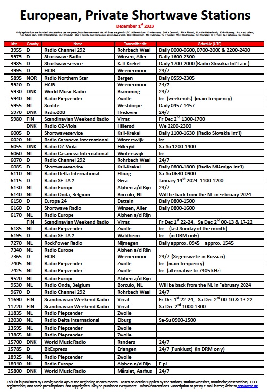 Actualizado Listado de Emisoras Privadas Europeas – Diciembre 2023 Por elradioescucha el 01/12/2023 Anuncios Ultimas Entradas 19/12/2025 Carrera por las licencias de FM en Suecia 19/12/2025 Ya Disponible ‘Music on Shortwave’ B25-V3.0 19/12/2025 Próximas emisiones de las estaciones imaginarias 19/12/2025 Shortwave Radiogram, del 19/12/25 al 1/1/26: programa 430 Comparte esto: Haz clic para compartir en X (Se abre en una ventana nueva) X Haz clic para compartir en Facebook (Se abre en una ventana nueva) Facebook Haz clic para compartir en Bluesky (Se abre en una ventana nueva) Bluesky Haz clic para compartir en Mastodon (Se abre en una ventana nueva) Mastodon Haz clic para compartir en Pinterest (Se abre en una ventana nueva) Pinterest Haz clic para compartir en WhatsApp (Se abre en una ventana nueva) WhatsApp Haz clic para compartir en Telegram (Se abre en una ventana nueva) Telegram Haz clic para imprimir (Se abre en una ventana nueva) Imprimir Haz clic para enviar un enlace por correo electrónico a un amigo (Se abre en una ventana nueva) Correo electrónico Haz clic para compartir en Pocket (Se abre en una ventana nueva) Pocket Haz clic para compartir en Reddit (Se abre en una ventana nueva) Reddit Me gusta Cargando...‹ SWR- Scandinavian Weekend Radio en el aire este fin de semanaFrecuencia Al Día Nº859 ›Categorías:FrecuenciasEtiquetas:Emisora de Onda Corta, Emisoras Privadas, Onda Corta, Shortwave, SWL Artículos relacionados Ya disponible -World English Survey – Agosto 2025 Ya disponible -World English Survey – July 2025 Actualizado Listado de Emisoras Privadas Europeas – Julio 2024 Actualizado Listado de Emisoras Privadas Europeas – Junio 2024