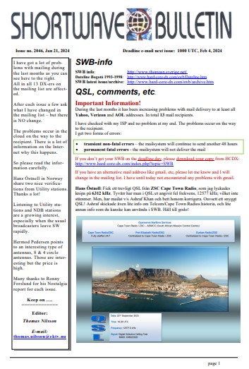 Ya disponible Shortwave Bulletin nº2046 Por elradioescucha el 23/01/2024 Enlace para la descarga:http://www.hard-core-dx.com/swb/archive.htm Anuncios Ultimas Entradas 08/01/2026 Radio Tumbril – Programación Encore 08/01/2026 Nueva emisión de From the Isle of Music via Channel 292. 07/01/2026 WorldDAB presenta su calendario de eventos internacionales 07/01/2026 Software para gestionar frecuencias con SDRSharp Comparte esto: Haz clic para compartir en X (Se abre en una ventana nueva) X Haz clic para compartir en Facebook (Se abre en una ventana nueva) Facebook Haz clic para compartir en Bluesky (Se abre en una ventana nueva) Bluesky Haz clic para compartir en Mastodon (Se abre en una ventana nueva) Mastodon Haz clic para compartir en Pinterest (Se abre en una ventana nueva) Pinterest Haz clic para compartir en WhatsApp (Se abre en una ventana nueva) WhatsApp Haz clic para compartir en Telegram (Se abre en una ventana nueva) Telegram Haz clic para imprimir (Se abre en una ventana nueva) Imprimir Haz clic para enviar un enlace por correo electrónico a un amigo (Se abre en una ventana nueva) Correo electrónico Haz clic para compartir en Pocket (Se abre en una ventana nueva) Pocket Haz clic para compartir en Reddit (Se abre en una ventana nueva) Reddit Me gusta Cargando...‹ Resumen Ultimas Escuchas100 AÑOS DE RADIO EN ESPAÑA ›Categorías:PublicaciónEtiquetas:Frecuencias, Onda Corta, Shortwave, Shortwave Bulletin, SWL Artículos relacionados Ya disponible Shortwave Bulletin nº2096 Boletín RUS-DX #1375 Ya Disponible DX Fanzine No. 148 Ya disponible la publicación Selvamar Noticias nº71