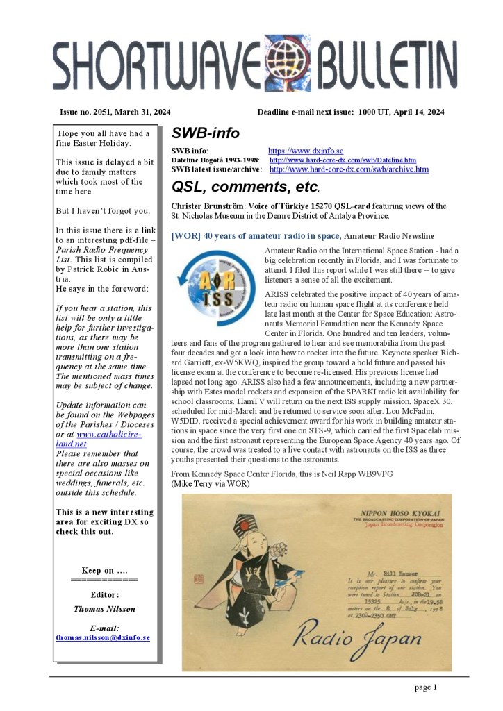 Ya disponible Shortwave Bulletin nº2051 Por elradioescucha el 02/04/2024 Enlace para la descarga:http://www.hard-core-dx.com/swb/archive.htm Anuncios Ultimas Entradas 20/12/2025 Reino Unido: Disfruta de la transmisión de Navidad del Rey en Onda Larga este año 20/12/2025 Radio City en el aire vía IRRS Milano 20/12/2025 Frecuencia Al Día Nº963 20/12/2025 Glenn Hauser’s World of Radio 2326 Comparte esto: Haz clic para compartir en X (Se abre en una ventana nueva) X Haz clic para compartir en Facebook (Se abre en una ventana nueva) Facebook Haz clic para compartir en Bluesky (Se abre en una ventana nueva) Bluesky Haz clic para compartir en Mastodon (Se abre en una ventana nueva) Mastodon Haz clic para compartir en Pinterest (Se abre en una ventana nueva) Pinterest Haz clic para compartir en WhatsApp (Se abre en una ventana nueva) WhatsApp Haz clic para compartir en Telegram (Se abre en una ventana nueva) Telegram Haz clic para imprimir (Se abre en una ventana nueva) Imprimir Haz clic para enviar un enlace por correo electrónico a un amigo (Se abre en una ventana nueva) Correo electrónico Haz clic para compartir en Pocket (Se abre en una ventana nueva) Pocket Haz clic para compartir en Reddit (Se abre en una ventana nueva) Reddit Me gusta Cargando...‹ Actualizado Listado de Emisoras Privadas Europeas – Abril 2024Disponible ‘Radioaficionados’ de Abril 2024 ›Categorías:PublicaciónEtiquetas:Frecuencias, Onda Corta, Shortwave, Shortwave Bulletin, SWL Artículos relacionados Boletín RUS-DX #1372 WORLDWIDE DX CLUB Top News #1638 Ya disponible Radiorama Numero 134– A.I.R. – Ya disponible Shortwave Bulletin nº2094