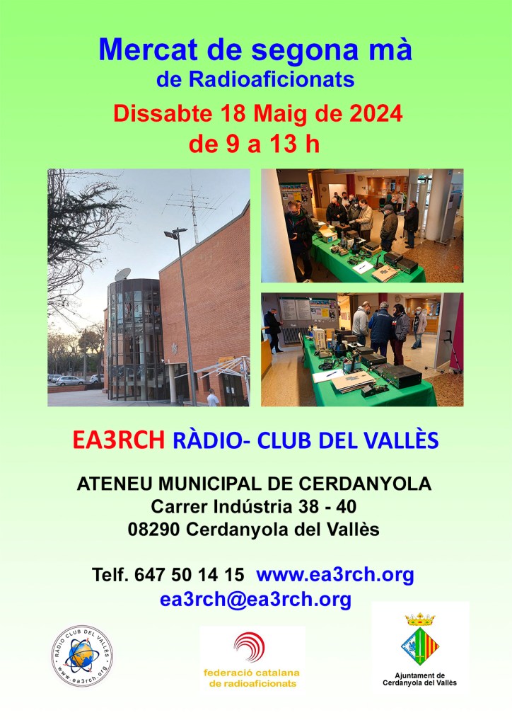 Según informa el RadioClub del Valles EA3-RCH este próximo sabado 18 de Mayo tendra lugar en el ateneo de Cerdanyola del Valles el tradicional mercado de segunda mano mensual.
