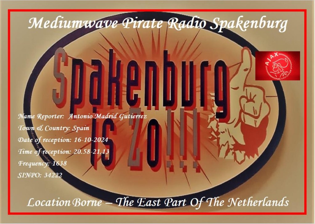 Recibida E-QSL de Radio Spakenburg Por elradioescucha el 18/10/2024 Recibida E-QSL de la emisora Radio Spakenburg desde Holanda ,escuchada a las 2058 UTC en la frecuencia de 1638 KHz. en idioma Ingles, llegó en 1 días, informe enviado a: spakenburg01@hotmail.com V/S:Henk Anuncios Ultimas Entradas 19/12/2025 Ya Disponible ‘Music on Shortwave’ B25-V3.0 19/12/2025 Próximas emisiones de las estaciones imaginarias 19/12/2025 Shortwave Radiogram, del 19/12/25 al 1/1/26: programa 430 18/12/2025 Que escuchar estas navidades de 2025 en Onda Corta Comparte esto: Haz clic para compartir en X (Se abre en una ventana nueva) X Haz clic para compartir en Facebook (Se abre en una ventana nueva) Facebook Haz clic para compartir en Bluesky (Se abre en una ventana nueva) Bluesky Haz clic para compartir en Mastodon (Se abre en una ventana nueva) Mastodon Haz clic para compartir en Pinterest (Se abre en una ventana nueva) Pinterest Haz clic para compartir en WhatsApp (Se abre en una ventana nueva) WhatsApp Haz clic para compartir en Telegram (Se abre en una ventana nueva) Telegram Haz clic para imprimir (Se abre en una ventana nueva) Imprimir Haz clic para enviar un enlace por correo electrónico a un amigo (Se abre en una ventana nueva) Correo electrónico Haz clic para compartir en Pocket (Se abre en una ventana nueva) Pocket Haz clic para compartir en Reddit (Se abre en una ventana nueva) Reddit Me gusta Cargando...‹ Shortwave Radiogram, del 17 al 23 de Octubre: programa 375L’ Altra Ràdio – Primer centre de computació quàntica d’IBM a Europa ›Categorías:Pirata, QSLEtiquetas:EQSL, Onda Media, Pirata, qsl, Verificacion Artículos relacionados Recibida E-QSL de Radio Bizon Recibida E-QSL de Radio Luka Recibida E-QSL Enterprise Radio Recibida E-QSL de Enterprise Radio