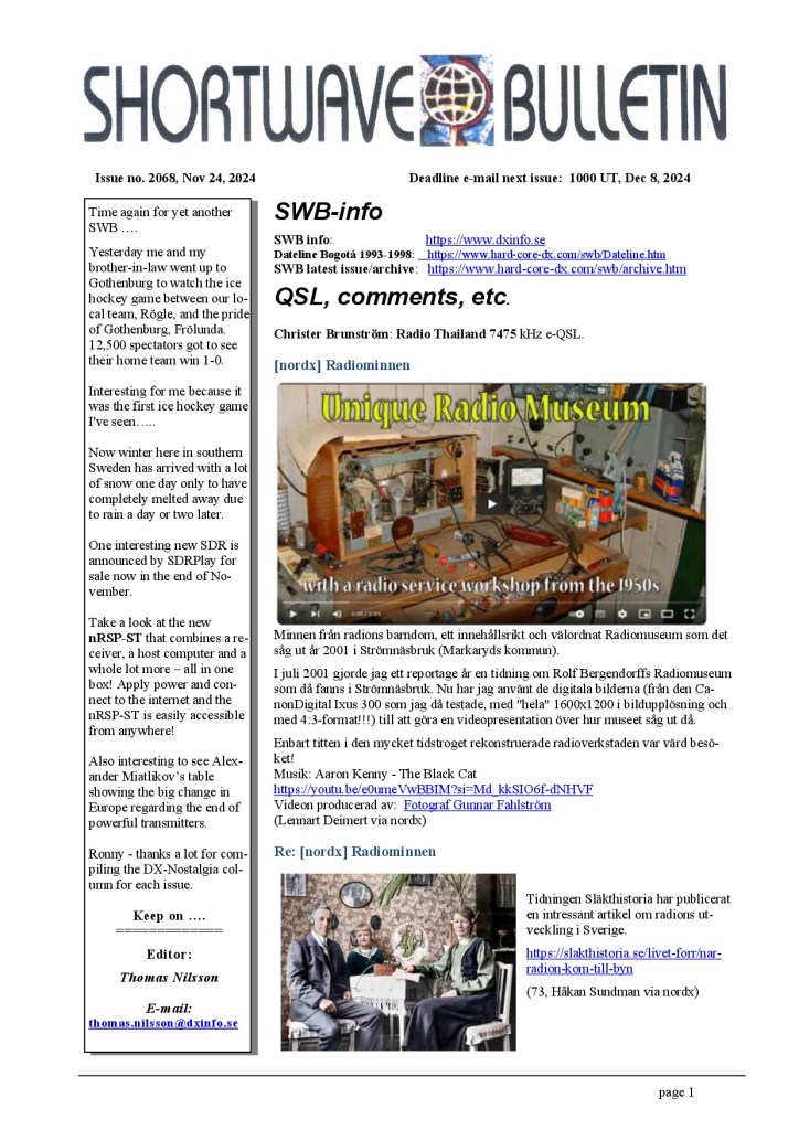 Ya disponible Shortwave Bulletin nº2068 Por elradioescucha el 26/11/2024 Enlace para la descarga:http://www.hard-core-dx.com/swb/archive.htm Anuncios Ultimas Entradas 19/12/2025 Carrera por las licencias de FM en Suecia 19/12/2025 Ya Disponible ‘Music on Shortwave’ B25-V3.0 19/12/2025 Próximas emisiones de las estaciones imaginarias 19/12/2025 Shortwave Radiogram, del 19/12/25 al 1/1/26: programa 430 Comparte esto: Haz clic para compartir en X (Se abre en una ventana nueva) X Haz clic para compartir en Facebook (Se abre en una ventana nueva) Facebook Haz clic para compartir en Bluesky (Se abre en una ventana nueva) Bluesky Haz clic para compartir en Mastodon (Se abre en una ventana nueva) Mastodon Haz clic para compartir en Pinterest (Se abre en una ventana nueva) Pinterest Haz clic para compartir en WhatsApp (Se abre en una ventana nueva) WhatsApp Haz clic para compartir en Telegram (Se abre en una ventana nueva) Telegram Haz clic para imprimir (Se abre en una ventana nueva) Imprimir Haz clic para enviar un enlace por correo electrónico a un amigo (Se abre en una ventana nueva) Correo electrónico Haz clic para compartir en Pocket (Se abre en una ventana nueva) Pocket Haz clic para compartir en Reddit (Se abre en una ventana nueva) Reddit Me gusta Cargando...‹ Rincón Diexista de Radio Rumanía InternacionalResumen Ultimas Escuchas ›Categorías:PublicaciónEtiquetas:Frecuencias, Onda Corta, Shortwave, Shortwave Bulletin, SWL Artículos relacionados Boletín RUS-DX #1372 WORLDWIDE DX CLUB Top News #1638 Ya disponible Radiorama Numero 134– A.I.R. – Ya disponible Shortwave Bulletin nº2094