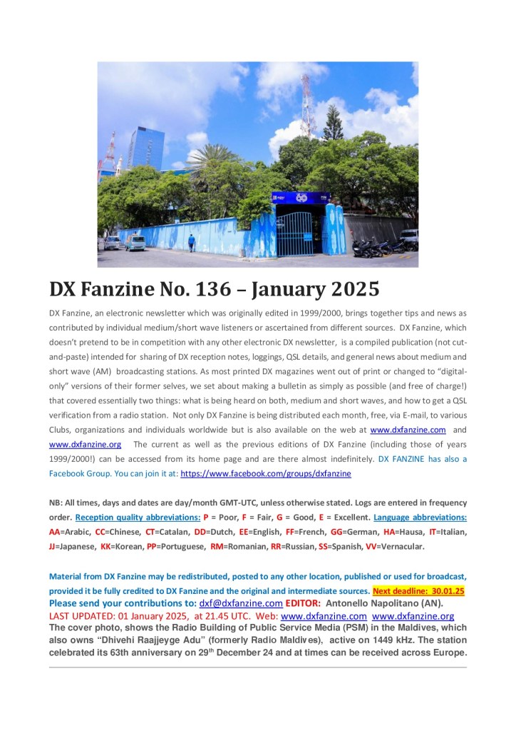 Ya Disponible DX Fanzine No. 136 Por elradioescucha el 02/01/2025 Pulsa Aqui para descargar en PDF Anuncios Ultimas Entradas 19/12/2025 Carrera por las licencias de FM en Suecia 19/12/2025 Ya Disponible ‘Music on Shortwave’ B25-V3.0 19/12/2025 Próximas emisiones de las estaciones imaginarias 19/12/2025 Shortwave Radiogram, del 19/12/25 al 1/1/26: programa 430 Comparte esto: Haz clic para compartir en X (Se abre en una ventana nueva) X Haz clic para compartir en Facebook (Se abre en una ventana nueva) Facebook Haz clic para compartir en Bluesky (Se abre en una ventana nueva) Bluesky Haz clic para compartir en Mastodon (Se abre en una ventana nueva) Mastodon Haz clic para compartir en Pinterest (Se abre en una ventana nueva) Pinterest Haz clic para compartir en WhatsApp (Se abre en una ventana nueva) WhatsApp Haz clic para compartir en Telegram (Se abre en una ventana nueva) Telegram Haz clic para imprimir (Se abre en una ventana nueva) Imprimir Haz clic para enviar un enlace por correo electrónico a un amigo (Se abre en una ventana nueva) Correo electrónico Haz clic para compartir en Pocket (Se abre en una ventana nueva) Pocket Haz clic para compartir en Reddit (Se abre en una ventana nueva) Reddit Me gusta Cargando...‹ La BBC celebra el centenario de la emisión del Shipping Forecast.Emisión Especial 39 Aniversario de Radio marconi Internaciocional ›CategorĆas:PublicaciónEtiquetas:Captaciones, DX Fanzine, Escuchas, Logs, qsl, Shortwave, SWL ArtĆculos relacionados BoletĆn RUS-DX #1372 WORLDWIDE DX CLUB Top News #1638 Ya disponible Radiorama Numero 134ā A.I.R. ā Ya disponible Shortwave Bulletin nĀŗ2094