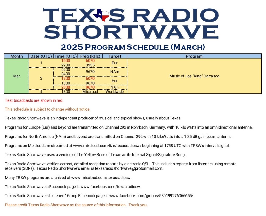 TRSW agradece los informes de recepción detallados enviados por correo electrónico a texasradioshortwave@protonmail.com. Esto incluye informes de oyentes que utilizan SDR remotos.