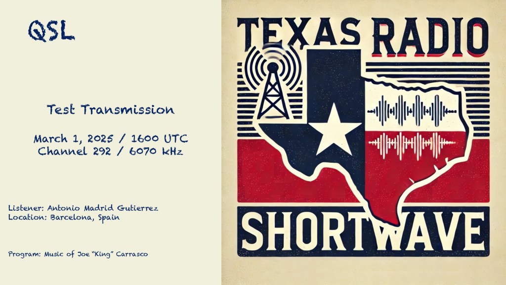 Recibida E-QSL de la emisora Texas Radio SW desde Alemania ,escuchada a las 1630 UTC en la frecuencia de 6070 KHz. en idioma Ingles, llegó en 2 días, informe enviado a: texasradioshortwave@protonmail.com V/S:Terry Colgan
