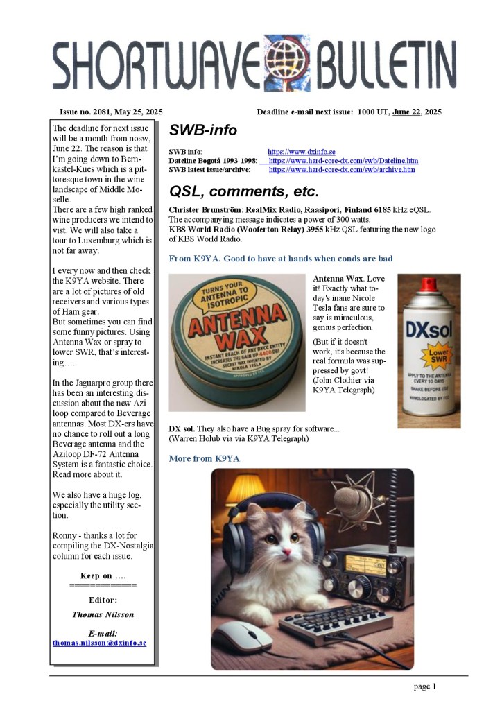 Ya disponible Shortwave Bulletin nº2081 Por elradioescucha el 27/05/2025 Enlace para la descarga:http://www.hard-core-dx.com/swb/archive.htm Anuncios Ultimas Entradas 20/12/2025 Reino Unido: Disfruta de la transmisión de Navidad del Rey en Onda Larga este año 20/12/2025 Radio City en el aire vía IRRS Milano 20/12/2025 Frecuencia Al Día Nº963 20/12/2025 Glenn Hauser’s World of Radio 2326 Comparte esto: Haz clic para compartir en X (Se abre en una ventana nueva) X Haz clic para compartir en Facebook (Se abre en una ventana nueva) Facebook Haz clic para compartir en Bluesky (Se abre en una ventana nueva) Bluesky Haz clic para compartir en Mastodon (Se abre en una ventana nueva) Mastodon Haz clic para compartir en Pinterest (Se abre en una ventana nueva) Pinterest Haz clic para compartir en WhatsApp (Se abre en una ventana nueva) WhatsApp Haz clic para compartir en Telegram (Se abre en una ventana nueva) Telegram Haz clic para imprimir (Se abre en una ventana nueva) Imprimir Haz clic para enviar un enlace por correo electrónico a un amigo (Se abre en una ventana nueva) Correo electrónico Haz clic para compartir en Pocket (Se abre en una ventana nueva) Pocket Haz clic para compartir en Reddit (Se abre en una ventana nueva) Reddit Me gusta Cargando...‹ Radio Exterior de España – 40 años de ‘Españoles en la mar’ a bordo de Elcano en República DominicanaMercatrom 14 – 1 de Junio 2025 en San Roque ›Categorías:PublicaciónEtiquetas:Frecuencias, Onda Corta, Shortwave, Shortwave Bulletin, SWL Artículos relacionados Boletín RUS-DX #1372 WORLDWIDE DX CLUB Top News #1638 Ya disponible Radiorama Numero 134– A.I.R. – Ya disponible Shortwave Bulletin nº2094