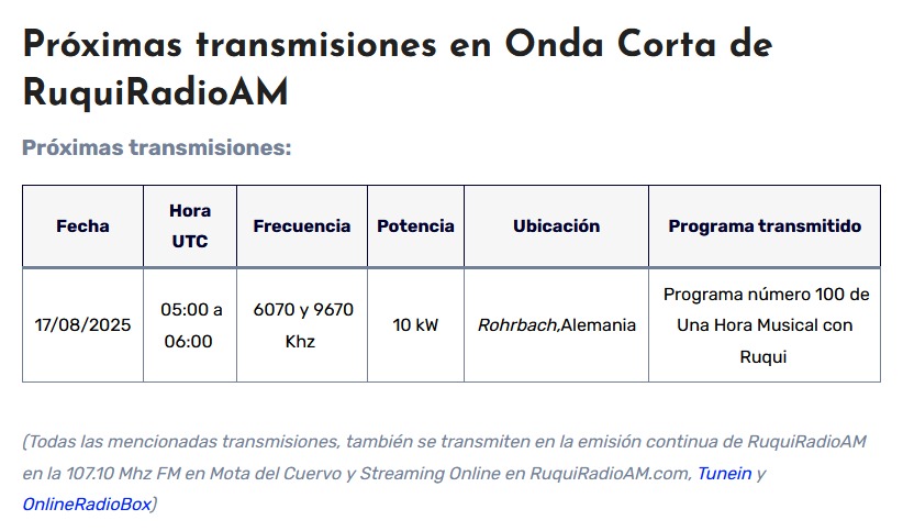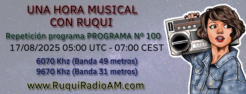 Nueva Emisión de Ruqui Radio AM Por elradioescucha el 16/08/2025 Informes de Recepción: http://ruquiradioam.com/informerecepcion/ Anuncios Ultimas Entradas 19/12/2025 Ya Disponible ‘Music on Shortwave’ B25-V3.0 19/12/2025 Próximas emisiones de las estaciones imaginarias 19/12/2025 Shortwave Radiogram, del 19/12/25 al 1/1/26: programa 430 18/12/2025 Que escuchar estas navidades de 2025 en Onda Corta Comparte esto: Haz clic para compartir en X (Se abre en una ventana nueva) X Haz clic para compartir en Facebook (Se abre en una ventana nueva) Facebook Haz clic para compartir en Bluesky (Se abre en una ventana nueva) Bluesky Haz clic para compartir en Mastodon (Se abre en una ventana nueva) Mastodon Haz clic para compartir en Pinterest (Se abre en una ventana nueva) Pinterest Haz clic para compartir en WhatsApp (Se abre en una ventana nueva) WhatsApp Haz clic para compartir en Telegram (Se abre en una ventana nueva) Telegram Haz clic para imprimir (Se abre en una ventana nueva) Imprimir Haz clic para enviar un enlace por correo electrónico a un amigo (Se abre en una ventana nueva) Correo electrónico Haz clic para compartir en Pocket (Se abre en una ventana nueva) Pocket Haz clic para compartir en Reddit (Se abre en una ventana nueva) Reddit Me gusta Cargando...‹ Radio City en el aire vía IRRS MilanoWORLDWIDE DX CLUB Top News #1626 ›Categorías:BroadcastingEtiquetas:Channel292, Frecuencias, Onda Corta, Ruqui Radio AM, Shortwave Artículos relacionados Próximas emisiones de las estaciones imaginarias Shortwave Radiogram, del 19/12/25 al 1/1/26: programa 430 Que escuchar estas navidades de 2025 en Onda Corta Uncle Bill’s Melting Pot