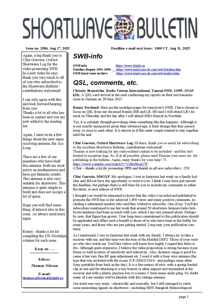 Ya disponible Shortwave Bulletin nº2086 Por elradioescucha el 19/08/2025 Enlace para la descarga:http://www.hard-core-dx.com/swb/archive.htm Anuncios Ultimas Entradas 19/12/2025 Ya Disponible ‘Music on Shortwave’ B25-V3.0 19/12/2025 Próximas emisiones de las estaciones imaginarias 19/12/2025 Shortwave Radiogram, del 19/12/25 al 1/1/26: programa 430 18/12/2025 Que escuchar estas navidades de 2025 en Onda Corta Comparte esto: Haz clic para compartir en X (Se abre en una ventana nueva) X Haz clic para compartir en Facebook (Se abre en una ventana nueva) Facebook Haz clic para compartir en Bluesky (Se abre en una ventana nueva) Bluesky Haz clic para compartir en Mastodon (Se abre en una ventana nueva) Mastodon Haz clic para compartir en Pinterest (Se abre en una ventana nueva) Pinterest Haz clic para compartir en WhatsApp (Se abre en una ventana nueva) WhatsApp Haz clic para compartir en Telegram (Se abre en una ventana nueva) Telegram Haz clic para imprimir (Se abre en una ventana nueva) Imprimir Haz clic para enviar un enlace por correo electrónico a un amigo (Se abre en una ventana nueva) Correo electrónico Haz clic para compartir en Pocket (Se abre en una ventana nueva) Pocket Haz clic para compartir en Reddit (Se abre en una ventana nueva) Reddit Me gusta Cargando...‹ Akashvani (All India Radio) solicita Informes de RecepciónRadio Tumbril – Programación Encore ›Categorías:PublicaciónEtiquetas:Frecuencias, Onda Corta, Shortwave, Shortwave Bulletin, SWL Artículos relacionados Boletín RUS-DX #1372 WORLDWIDE DX CLUB Top News #1638 Ya disponible Radiorama Numero 134– A.I.R. – Ya disponible Shortwave Bulletin nº2094