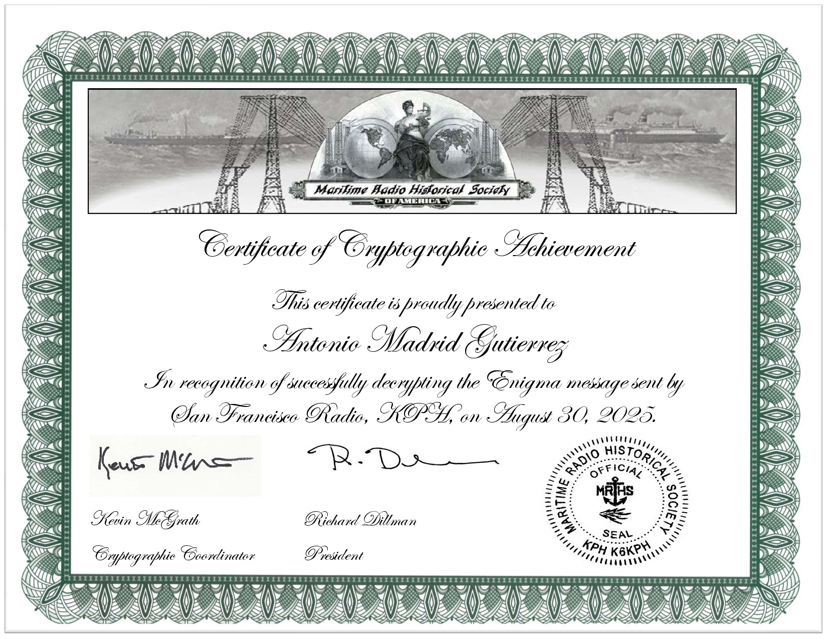 Recibido el certificado por descifrar el mensaje Enigma emitido por la KPH el pasado 30 de Agosto de 2025.