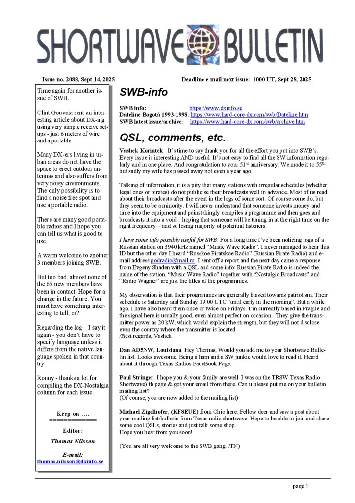 Ya disponible Shortwave Bulletin nº2088 Por elradioescucha el 17/09/2025 Enlace para la descarga:http://www.hard-core-dx.com/swb/archive.htm Anuncios Ultimas Entradas 19/12/2025 Ya Disponible ‘Music on Shortwave’ B25-V3.0 19/12/2025 Próximas emisiones de las estaciones imaginarias 19/12/2025 Shortwave Radiogram, del 19/12/25 al 1/1/26: programa 430 18/12/2025 Que escuchar estas navidades de 2025 en Onda Corta Comparte esto: Haz clic para compartir en X (Se abre en una ventana nueva) X Haz clic para compartir en Facebook (Se abre en una ventana nueva) Facebook Haz clic para compartir en Bluesky (Se abre en una ventana nueva) Bluesky Haz clic para compartir en Mastodon (Se abre en una ventana nueva) Mastodon Haz clic para compartir en Pinterest (Se abre en una ventana nueva) Pinterest Haz clic para compartir en WhatsApp (Se abre en una ventana nueva) WhatsApp Haz clic para compartir en Telegram (Se abre en una ventana nueva) Telegram Haz clic para imprimir (Se abre en una ventana nueva) Imprimir Haz clic para enviar un enlace por correo electrónico a un amigo (Se abre en una ventana nueva) Correo electrónico Haz clic para compartir en Pocket (Se abre en una ventana nueva) Pocket Haz clic para compartir en Reddit (Se abre en una ventana nueva) Reddit Me gusta Cargando...‹ Ya disponible Radiorama Numero 133– A.I.R. –15a Trobada Castell de Montesquiu 2025 ›Categorías:PublicaciónEtiquetas:Frecuencias, Onda Corta, Shortwave, Shortwave Bulletin, SWL Artículos relacionados Boletín RUS-DX #1372 WORLDWIDE DX CLUB Top News #1638 Ya disponible Radiorama Numero 134– A.I.R. – Ya disponible Shortwave Bulletin nº2094