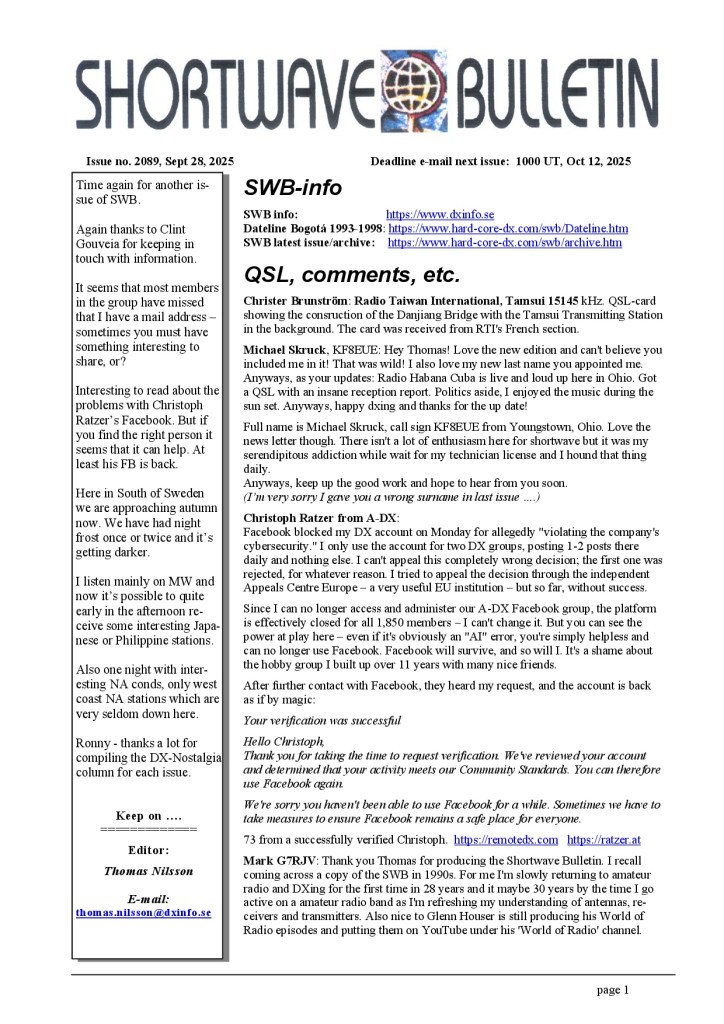 Ya disponible Shortwave Bulletin nº2089 Por elradioescucha el 01/10/2025 Enlace para la descarga:http://www.hard-core-dx.com/swb/archive.htm Anuncios Ultimas Entradas 19/12/2025 Ya Disponible ‘Music on Shortwave’ B25-V3.0 19/12/2025 Próximas emisiones de las estaciones imaginarias 19/12/2025 Shortwave Radiogram, del 19/12/25 al 1/1/26: programa 430 18/12/2025 Que escuchar estas navidades de 2025 en Onda Corta Comparte esto: Haz clic para compartir en X (Se abre en una ventana nueva) X Haz clic para compartir en Facebook (Se abre en una ventana nueva) Facebook Haz clic para compartir en Bluesky (Se abre en una ventana nueva) Bluesky Haz clic para compartir en Mastodon (Se abre en una ventana nueva) Mastodon Haz clic para compartir en Pinterest (Se abre en una ventana nueva) Pinterest Haz clic para compartir en WhatsApp (Se abre en una ventana nueva) WhatsApp Haz clic para compartir en Telegram (Se abre en una ventana nueva) Telegram Haz clic para imprimir (Se abre en una ventana nueva) Imprimir Haz clic para enviar un enlace por correo electrónico a un amigo (Se abre en una ventana nueva) Correo electrónico Haz clic para compartir en Pocket (Se abre en una ventana nueva) Pocket Haz clic para compartir en Reddit (Se abre en una ventana nueva) Reddit Me gusta Cargando...‹ Radio Clásica cumple 60 añosYa disponible la publicación Selvamar Noticias nº68 ›Categorías:PublicaciónEtiquetas:Frecuencias, Onda Corta, Shortwave, Shortwave Bulletin, SWL Artículos relacionados Boletín RUS-DX #1372 WORLDWIDE DX CLUB Top News #1638 Ya disponible Radiorama Numero 134– A.I.R. – Ya disponible Shortwave Bulletin nº2094