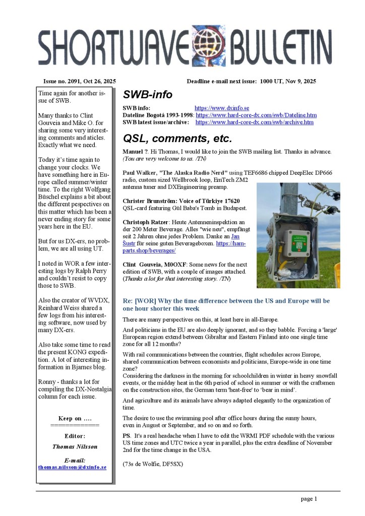 Ya disponible Shortwave Bulletin nº2091 Por elradioescucha el 28/10/2025 Enlace para la descarga:http://www.hard-core-dx.com/swb/archive.htm Anuncios Ultimas Entradas 19/12/2025 Ya Disponible ‘Music on Shortwave’ B25-V3.0 19/12/2025 Próximas emisiones de las estaciones imaginarias 19/12/2025 Shortwave Radiogram, del 19/12/25 al 1/1/26: programa 430 18/12/2025 Que escuchar estas navidades de 2025 en Onda Corta Comparte esto: Haz clic para compartir en X (Se abre en una ventana nueva) X Haz clic para compartir en Facebook (Se abre en una ventana nueva) Facebook Haz clic para compartir en Bluesky (Se abre en una ventana nueva) Bluesky Haz clic para compartir en Mastodon (Se abre en una ventana nueva) Mastodon Haz clic para compartir en Pinterest (Se abre en una ventana nueva) Pinterest Haz clic para compartir en WhatsApp (Se abre en una ventana nueva) WhatsApp Haz clic para compartir en Telegram (Se abre en una ventana nueva) Telegram Haz clic para imprimir (Se abre en una ventana nueva) Imprimir Haz clic para enviar un enlace por correo electrónico a un amigo (Se abre en una ventana nueva) Correo electrónico Haz clic para compartir en Pocket (Se abre en una ventana nueva) Pocket Haz clic para compartir en Reddit (Se abre en una ventana nueva) Reddit Me gusta Cargando...‹ Resumen Ultimas EscuchasChina Radio Internacional Horarios y Frecuencias Invierno 2025-26 ›Categorías:PublicaciónEtiquetas:Frecuencias, Onda Corta, Shortwave, Shortwave Bulletin, SWL Artículos relacionados Boletín RUS-DX #1372 WORLDWIDE DX CLUB Top News #1638 Ya disponible Radiorama Numero 134– A.I.R. – Ya disponible Shortwave Bulletin nº2094