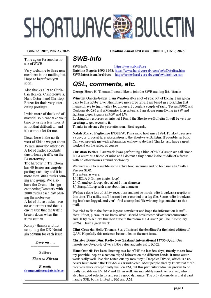 Ya disponible Shortwave Bulletin nº2093 Por elradioescucha el 25/11/2025 Enlace para la descarga:http://www.hard-core-dx.com/swb/archive.htm Anuncios Ultimas Entradas 19/12/2025 Carrera por las licencias de FM en Suecia 19/12/2025 Ya Disponible ‘Music on Shortwave’ B25-V3.0 19/12/2025 Próximas emisiones de las estaciones imaginarias 19/12/2025 Shortwave Radiogram, del 19/12/25 al 1/1/26: programa 430 Comparte esto: Haz clic para compartir en X (Se abre en una ventana nueva) X Haz clic para compartir en Facebook (Se abre en una ventana nueva) Facebook Haz clic para compartir en Bluesky (Se abre en una ventana nueva) Bluesky Haz clic para compartir en Mastodon (Se abre en una ventana nueva) Mastodon Haz clic para compartir en Pinterest (Se abre en una ventana nueva) Pinterest Haz clic para compartir en WhatsApp (Se abre en una ventana nueva) WhatsApp Haz clic para compartir en Telegram (Se abre en una ventana nueva) Telegram Haz clic para imprimir (Se abre en una ventana nueva) Imprimir Haz clic para enviar un enlace por correo electrónico a un amigo (Se abre en una ventana nueva) Correo electrónico Haz clic para compartir en Pocket (Se abre en una ventana nueva) Pocket Haz clic para compartir en Reddit (Se abre en una ventana nueva) Reddit Me gusta Cargando...‹ Resumen Ultimas EscuchasEmisión Especial 6º Aniversario TEXAS Radio Shortwave ›Categorías:PublicaciónEtiquetas:Frecuencias, Onda Corta, Shortwave, Shortwave Bulletin, SWL Artículos relacionados Boletín RUS-DX #1372 WORLDWIDE DX CLUB Top News #1638 Ya disponible Radiorama Numero 134– A.I.R. – Ya disponible Shortwave Bulletin nº2094