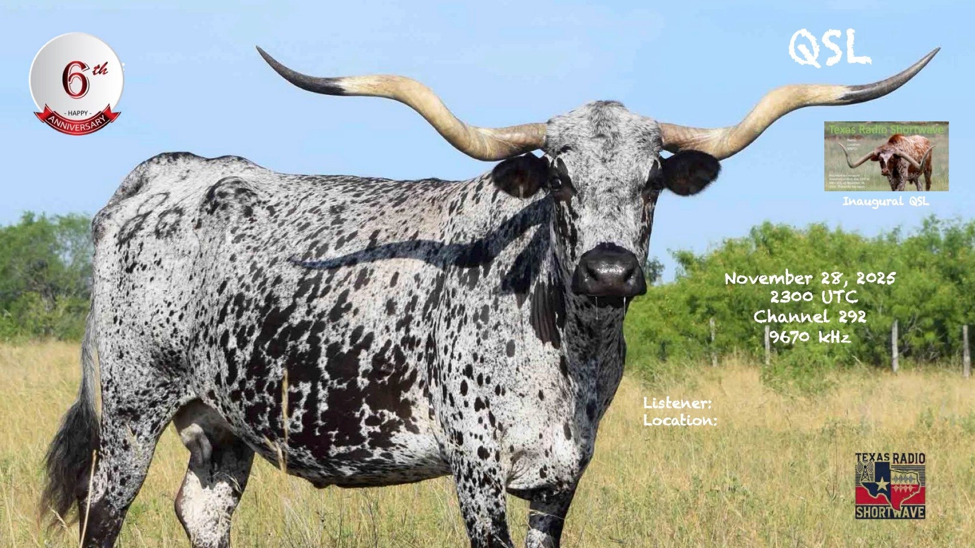Send a correct, detailed reception report, and you’ll get our sixth-anniversary QSL, which continues this year’s theme featuring Longhorn cattle. Our email is texasradioshortwave@protonmail.com