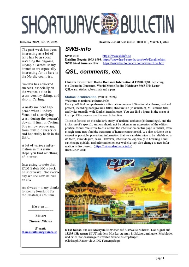 Ya disponible Shortwave Bulletin nº2099 Por elradioescucha el 17/02/2026 Enlace para la descarga:http://www.hard-core-dx.com/swb/archive.htm Anuncios Ultimas Entradas 17/02/2026 Ya disponible Shortwave Bulletin nº2099 16/02/2026 Rincón Diexista de Radio Rumanía Internacional 15/02/2026 L’altra ràdio – La intel·ligència artificial i l’Ateneu Barcelonès 15/02/2026 Boletín RUS-DX #1381 Comparte esto: Compartir en X (Se abre en una ventana nueva) X Comparte en Facebook (Se abre en una ventana nueva) Facebook Compartir en Bluesky (Se abre en una ventana nueva) Bluesky Compartir en Mastodon (Se abre en una ventana nueva) Mastodon Haz clic en Pinterest (Se abre en una ventana nueva) Pinterest Compartir en WhatsApp (Se abre en una ventana nueva) WhatsApp Compartir en Telegram (Se abre en una ventana nueva) Telegram Imprimir (Se abre en una ventana nueva) Imprimir Enviar un enlace a un amigo por correo electrónico (Se abre en una ventana nueva) Correo electrónico Compartir en Pocket (Se abre en una ventana nueva) Pocket Compartir en Reddit (Se abre en una ventana nueva) Reddit Me gusta Cargando...‹ Rincón Diexista de Radio Rumanía InternacionalCategorías:PublicaciónEtiquetas:Frecuencias, Onda Corta, Shortwave, Shortwave Bulletin, SWL Artículos relacionados Boletín RUS-DX #1381 WORLDWIDE DX CLUB Top News #1644 Ya disponible Radiorama Numero 135– A.I.R. – Boletín RUS-DX #1380