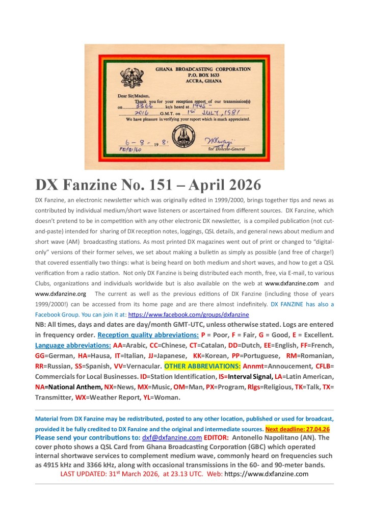 Ya Disponible DX Fanzine No. 151 Por elradioescucha el 02/04/2026 Pulsa aqui para descargar la publicacion. Anuncios Ultimas Entradas 02/04/2026 Ya Disponible DX Fanzine No. 151 02/04/2026 Ya disponible Shortwave Bulletin nĀŗ2102 01/04/2026 Cómo los radioaficionados localizaron mensajes cifrados 01/04/2026 Ya disponible la publicación Selvamar Noticias nĀŗ74 Comparte esto: Compartir en X (Se abre en una ventana nueva) X Comparte en Facebook (Se abre en una ventana nueva) Facebook Compartir en Bluesky (Se abre en una ventana nueva) Bluesky Compartir en Mastodon (Se abre en una ventana nueva) Mastodon Haz clic en Pinterest (Se abre en una ventana nueva) Pinterest Compartir en WhatsApp (Se abre en una ventana nueva) WhatsApp Compartir en Telegram (Se abre en una ventana nueva) Telegram Imprimir (Se abre en una ventana nueva) Imprimir Enviar un enlace a un amigo por correo electrónico (Se abre en una ventana nueva) Correo electrónico Compartir en Reddit (Se abre en una ventana nueva) Reddit Me gusta Cargando...‹ Ya disponible Shortwave Bulletin nĀŗ2102CategorĆas:PublicaciónEtiquetas:Captaciones, DX Fanzine, Escuchas, Logs, qsl, Shortwave, SWL ArtĆculos relacionados Ya disponible Shortwave Bulletin nĀŗ2102 Ya disponible la publicación Selvamar Noticias nĀŗ74 BoletĆn RUS-DX #1387 WORLDWIDE DX CLUB Top News #1649