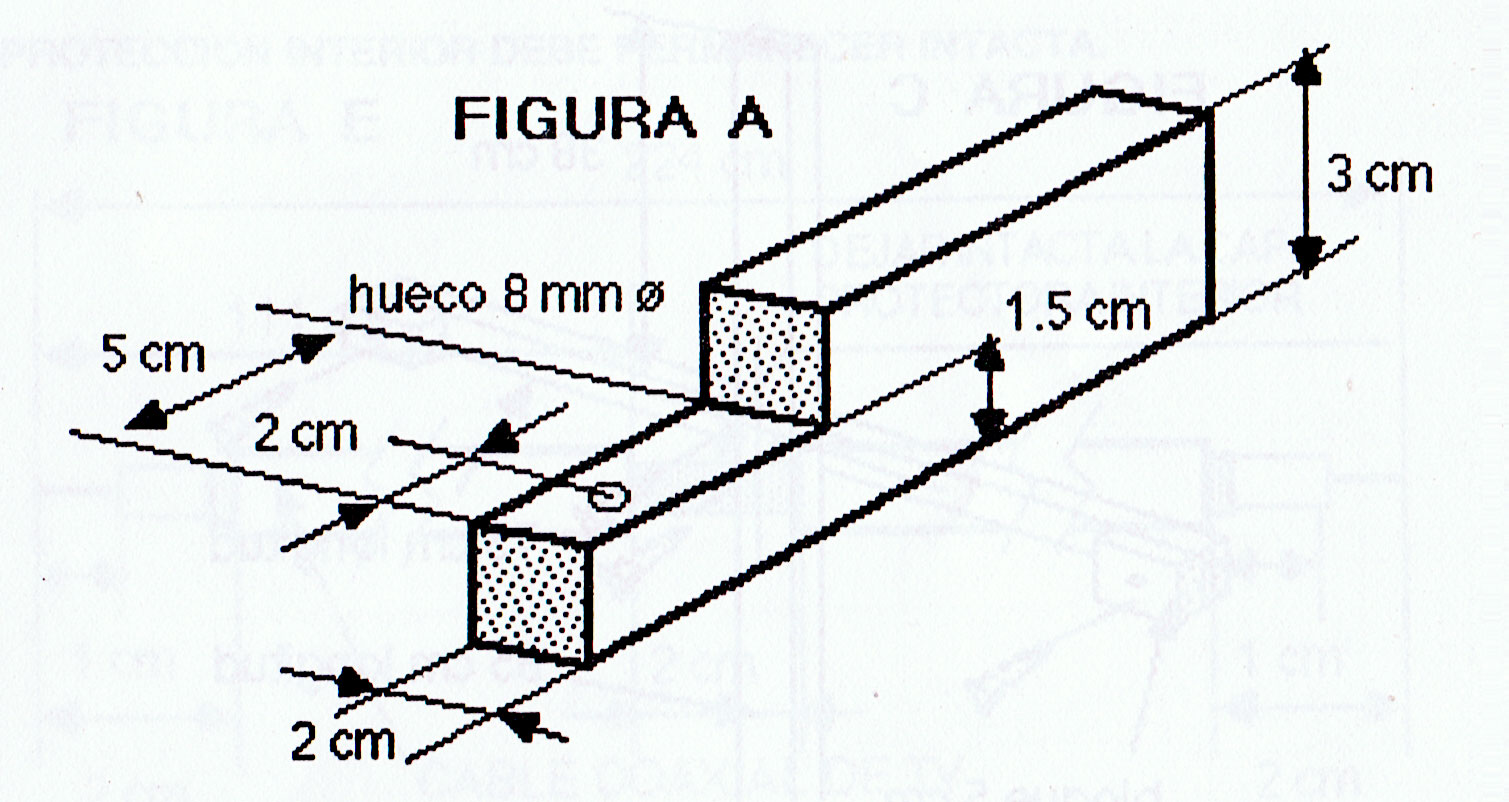 7. Después de esto se puede hacer el aro interno. Tome el cable coaxial que sobre (aproximadamente 2,75 metros) y retire en uno de los extremos 2 cms. de la capa aislante y la capa protectora exterior. Corte después 1 cm. de la capa aislante interior. Corte a una distancia de 23 cms. de este extremo 2 cms. de la capa aislante exterior . (Vea figura G)
